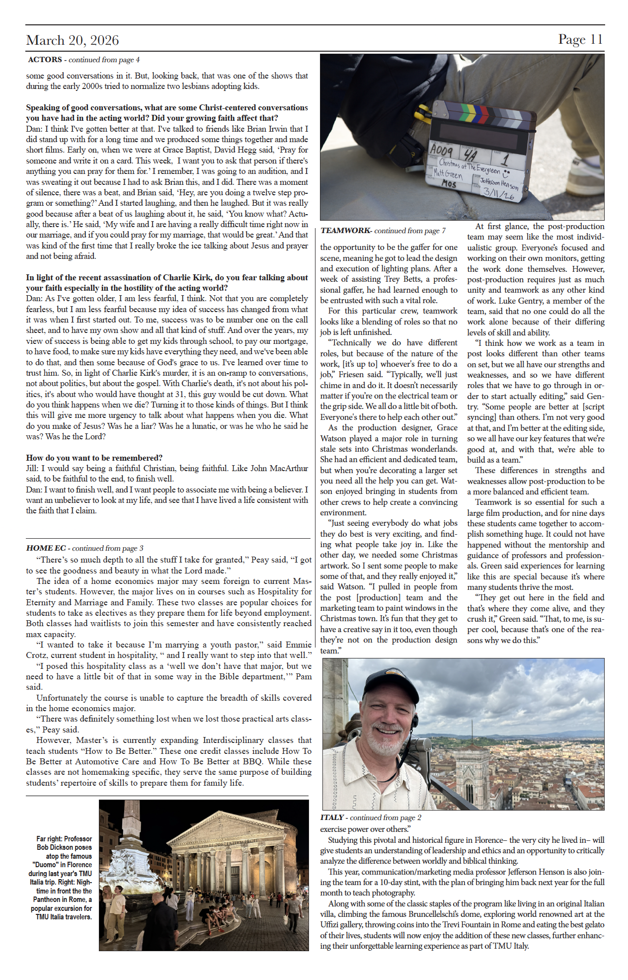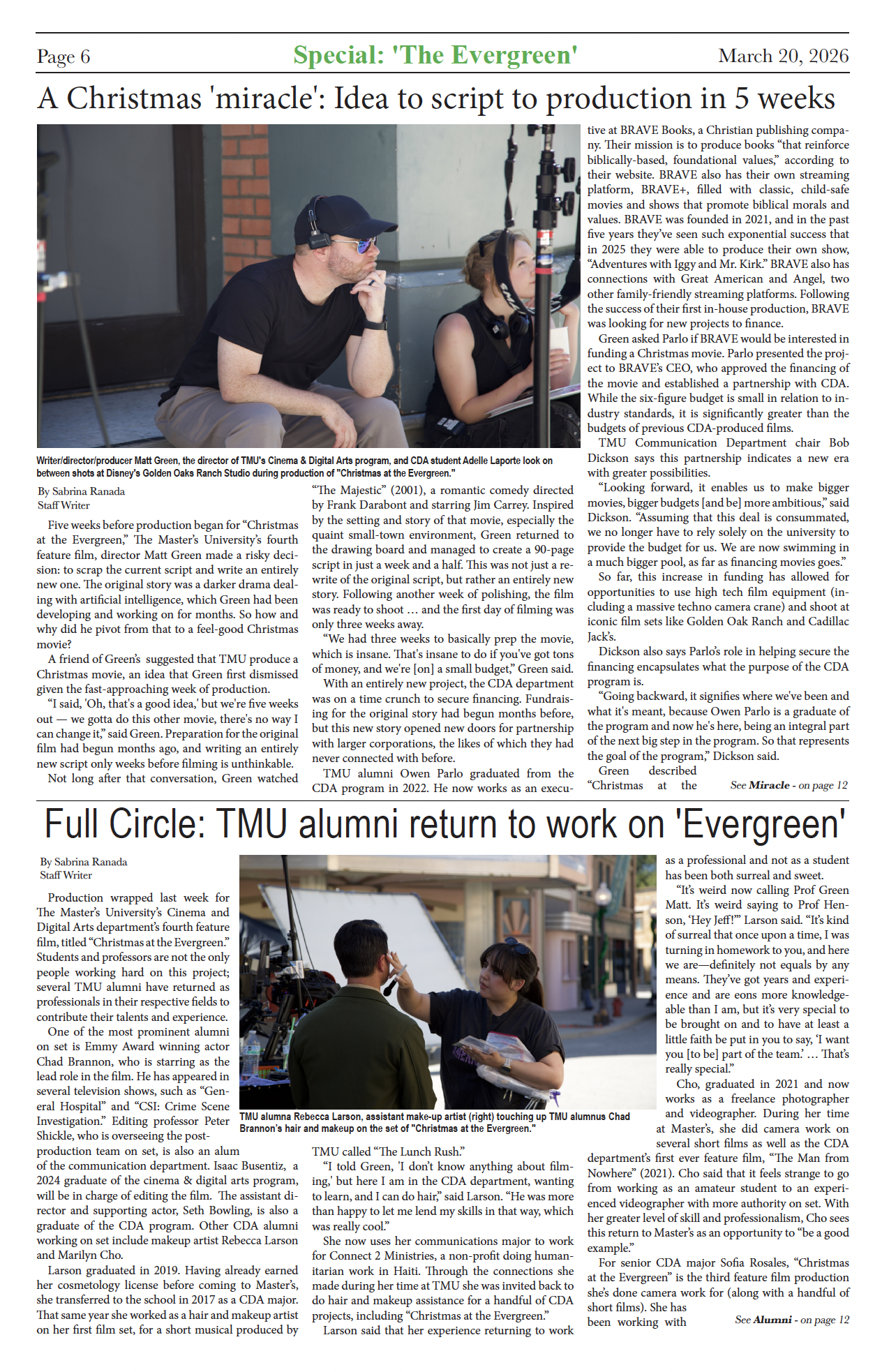 The Master’s University’s Cinema & Digital Arts program began production on their fourth feature film Saturday, titled Christmas at the Evergreen. This will be their first Christmas movie, and will star actors Chad Brannon, Seth Bowling, Alex Camacho and Kirk Cameron (known for his roles in Growing Pains (1985-1992) and Fireproof (2008)).