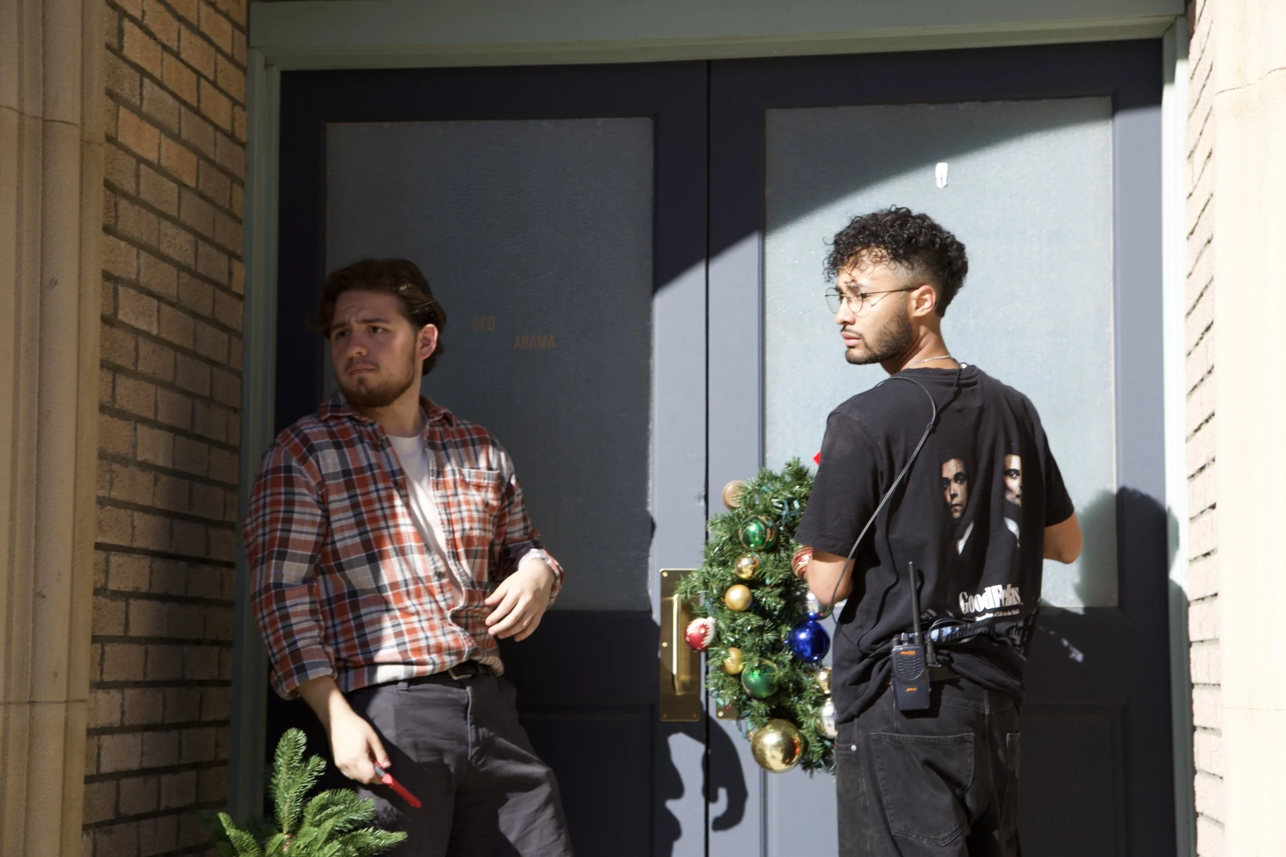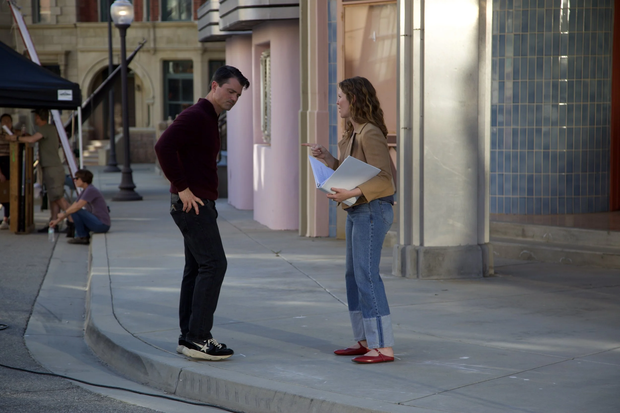 Brannon (left) and Camacho (right) rehearsing a scene in between takes.