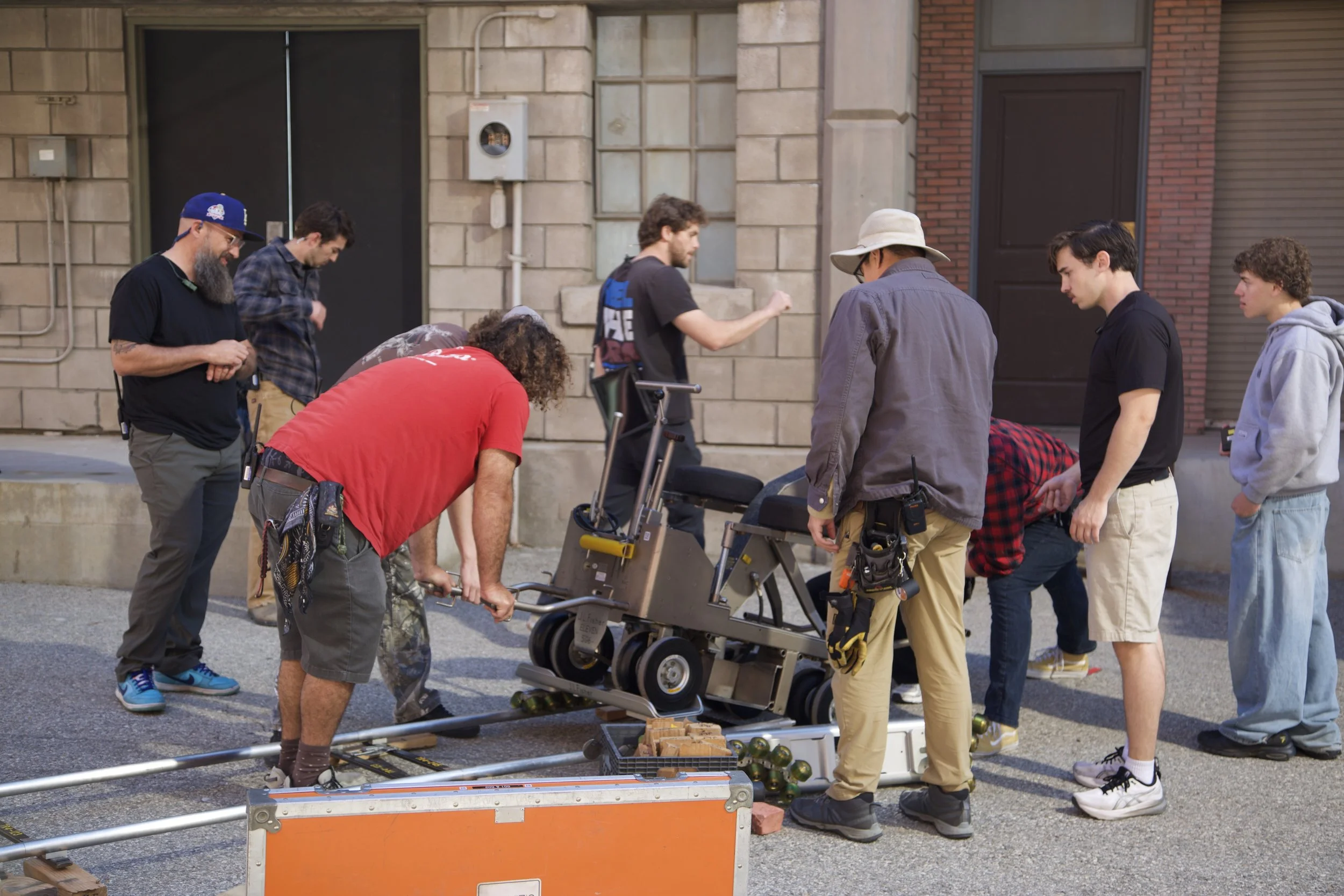Grip crew collaborating to set up a complex camera dolly, which is used to create smooth camera movement.