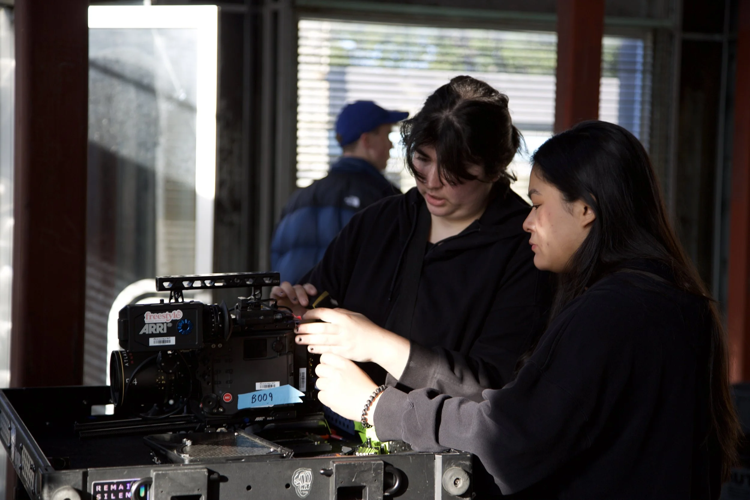Students Bella Nunez (camera B operator) and Kiana Arzate (B cam 1st AC) setting up the B camera immediately after arriving on set.