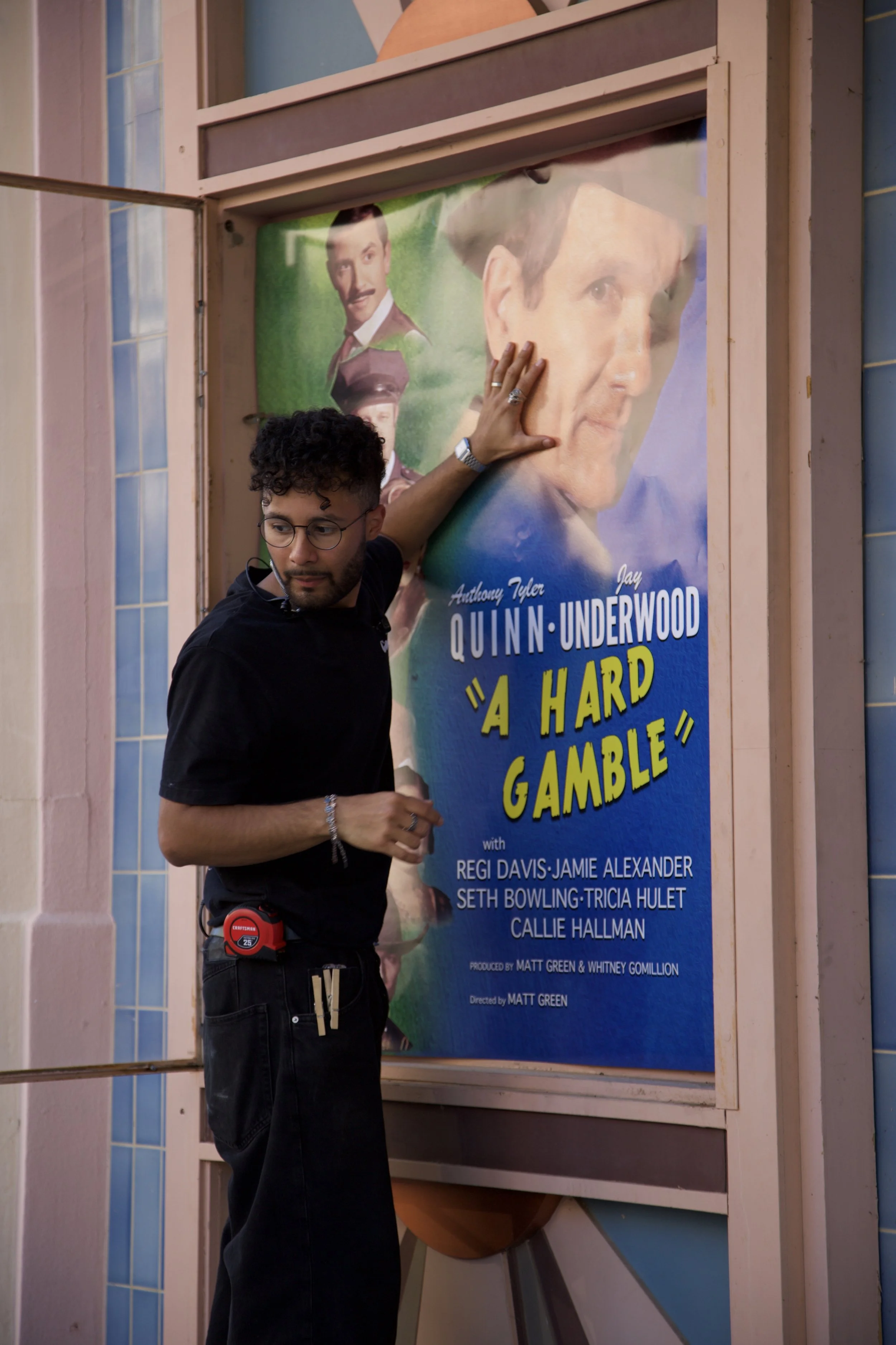 Vasquez hanging a movie poster for “A Hard Gamble,” a cameo for the 2018 short film directed by Green.