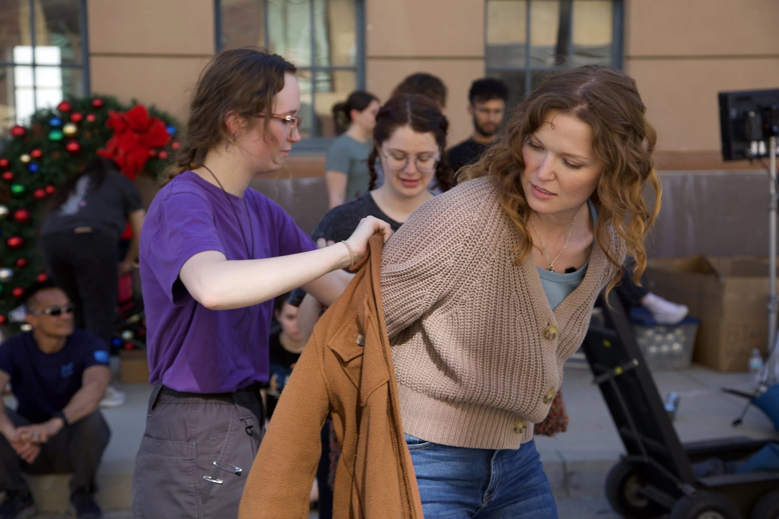 The wardrobe of TMU alumni, Lily Underwood (back) and Carrie Clausen (left) prep Camacho, who plays “Michelle” for a scene.