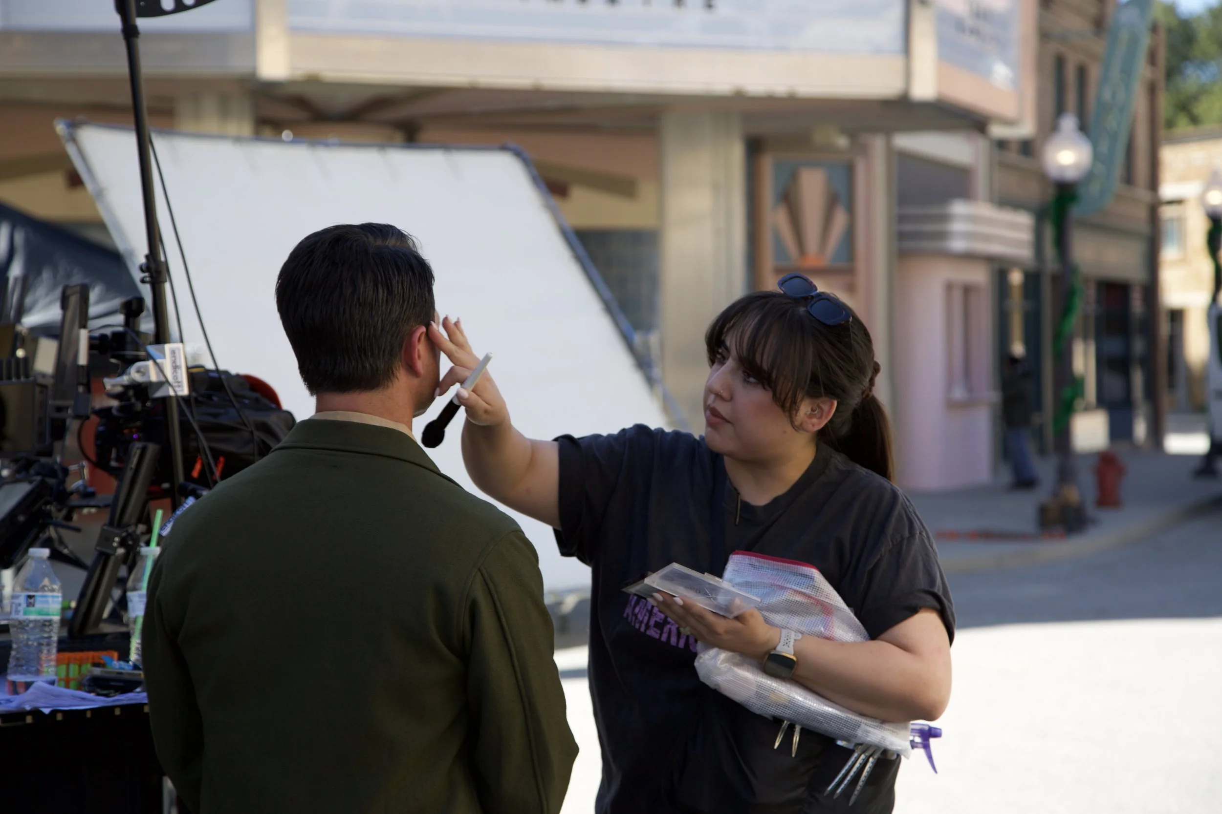 TMU alumni Rebecca Larson, assistant make-up artist (right) touching up Brannon’s hair and makeup.