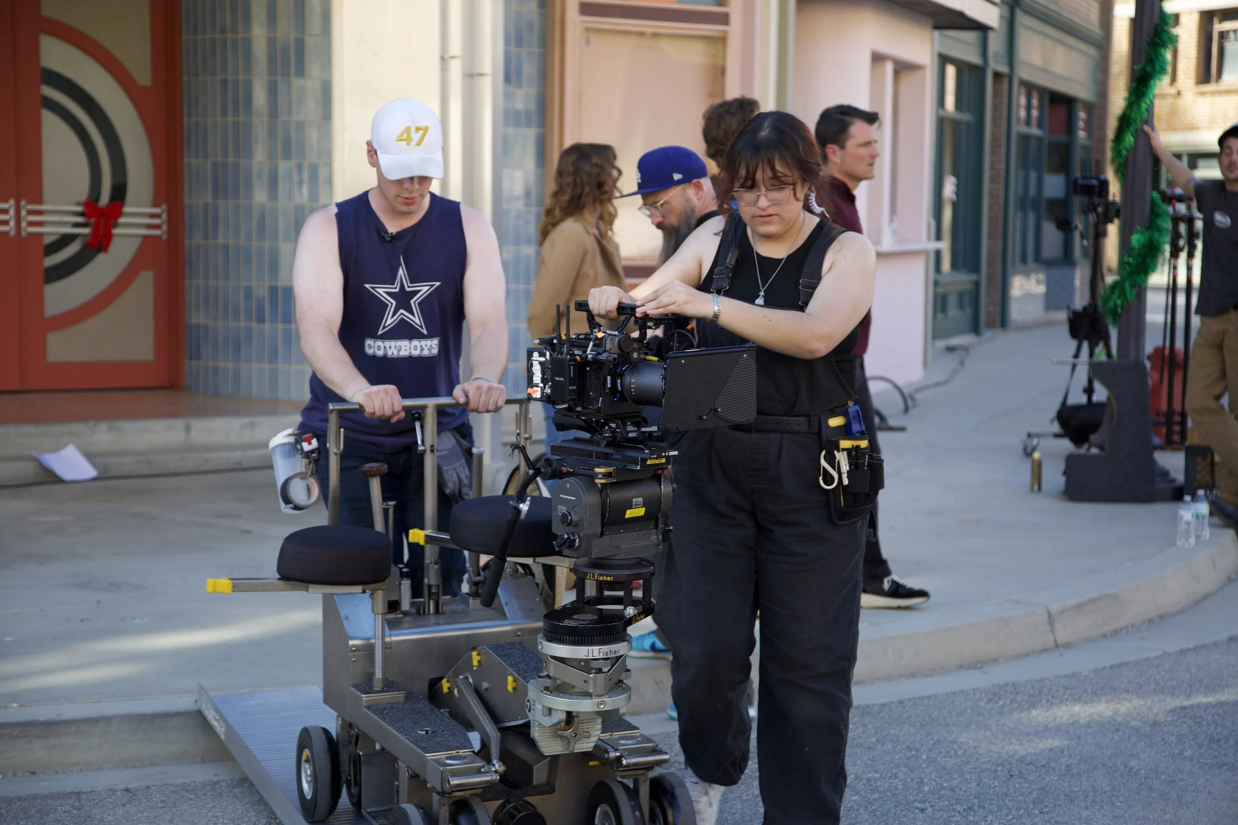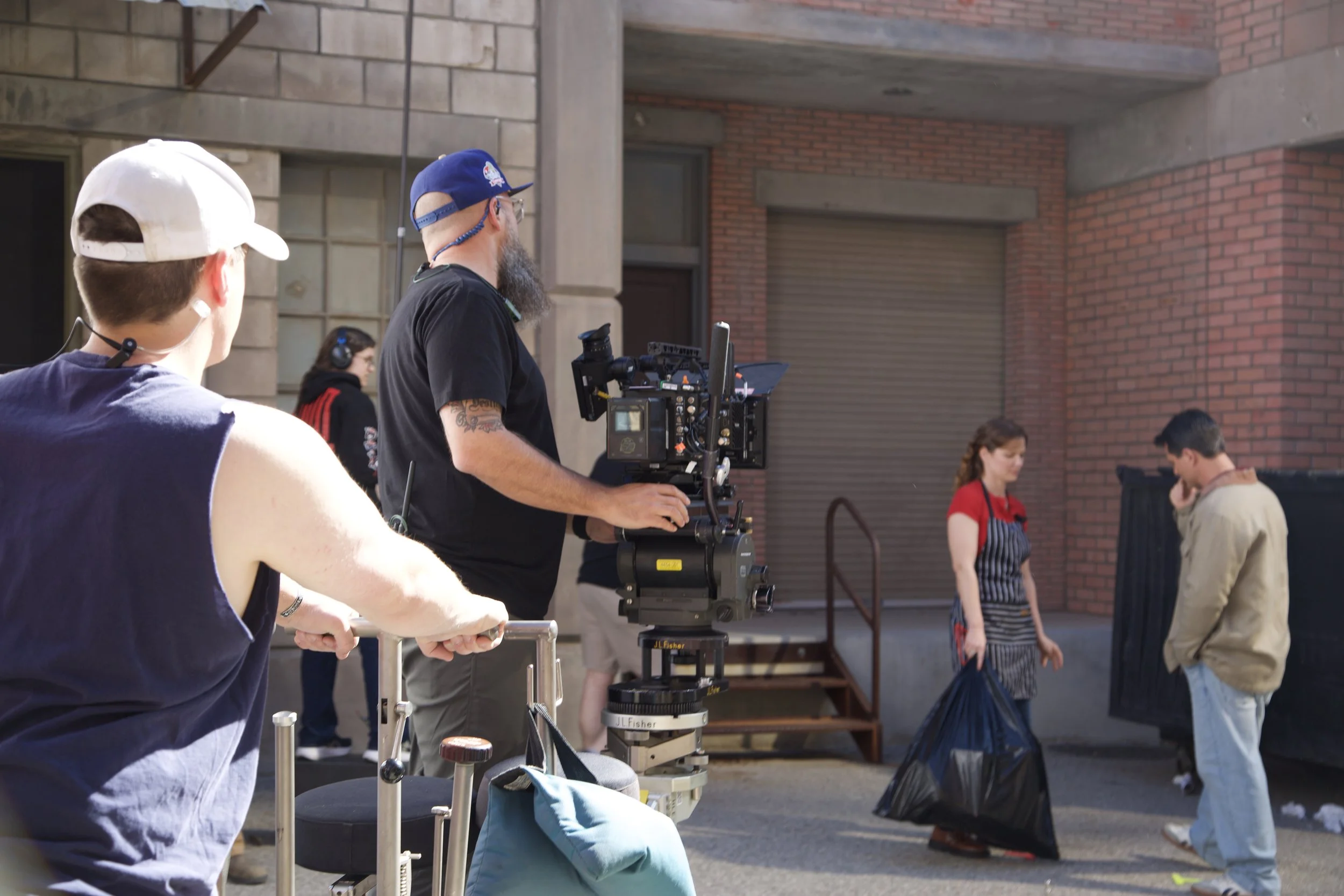 Director of photography Jefferson Henson (wearing the blue hat) filming a scene with co-leads Chad Brannon (right) and actor Alex Camacho (left) while on the dolly.