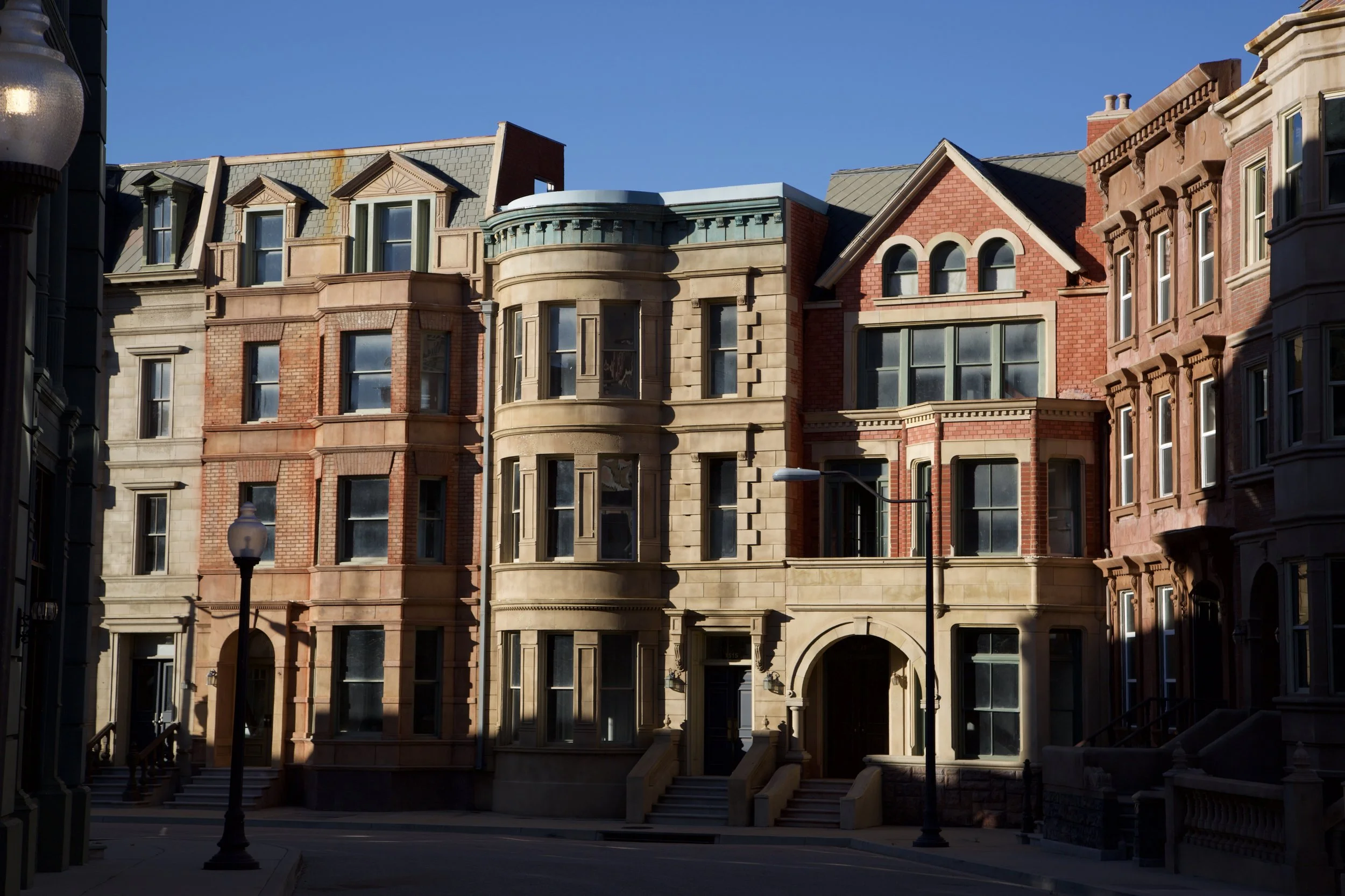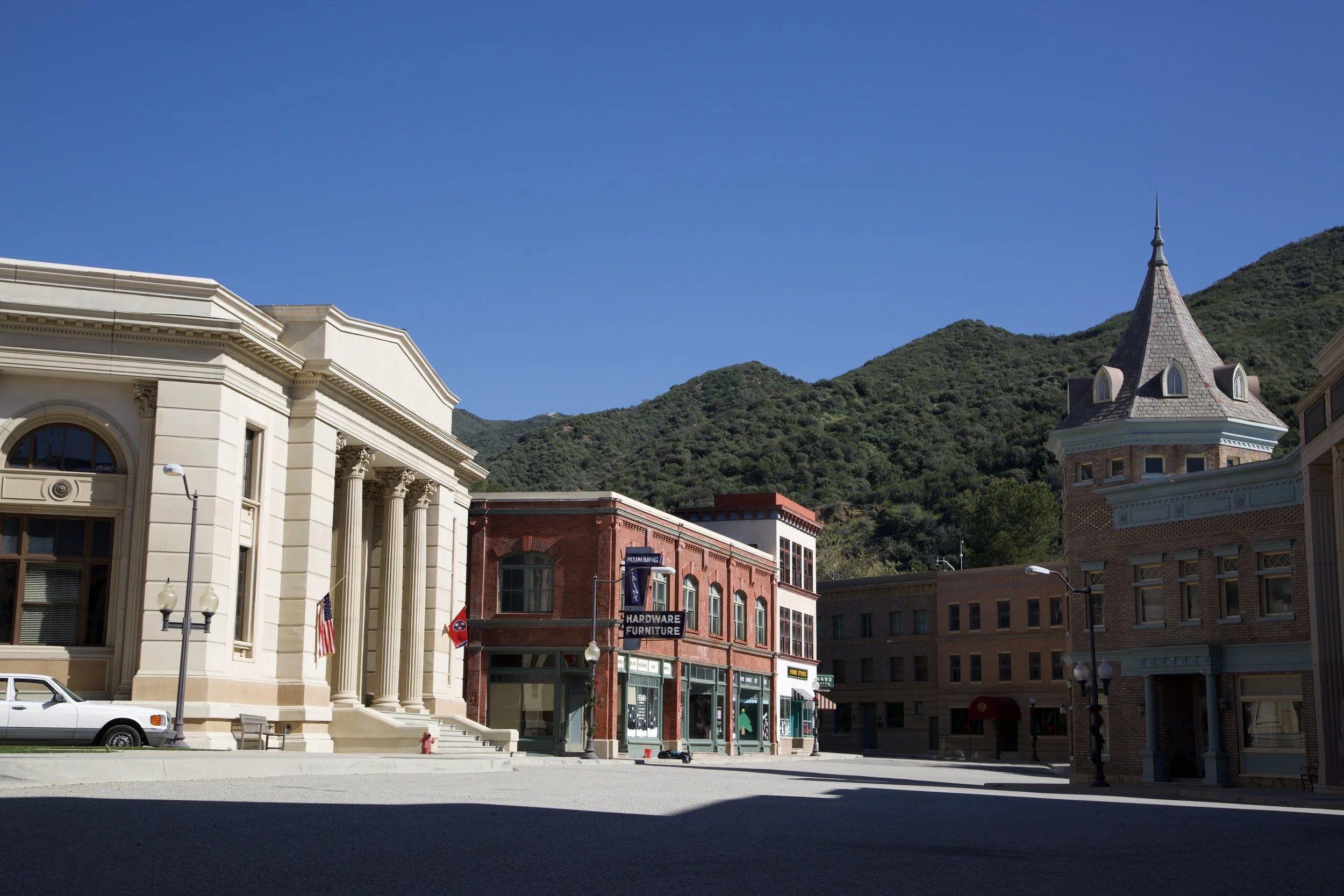 Another view of the town center set, including a large town hall with the state flag of Tennessee (where most of the film takes place) hanging outside.