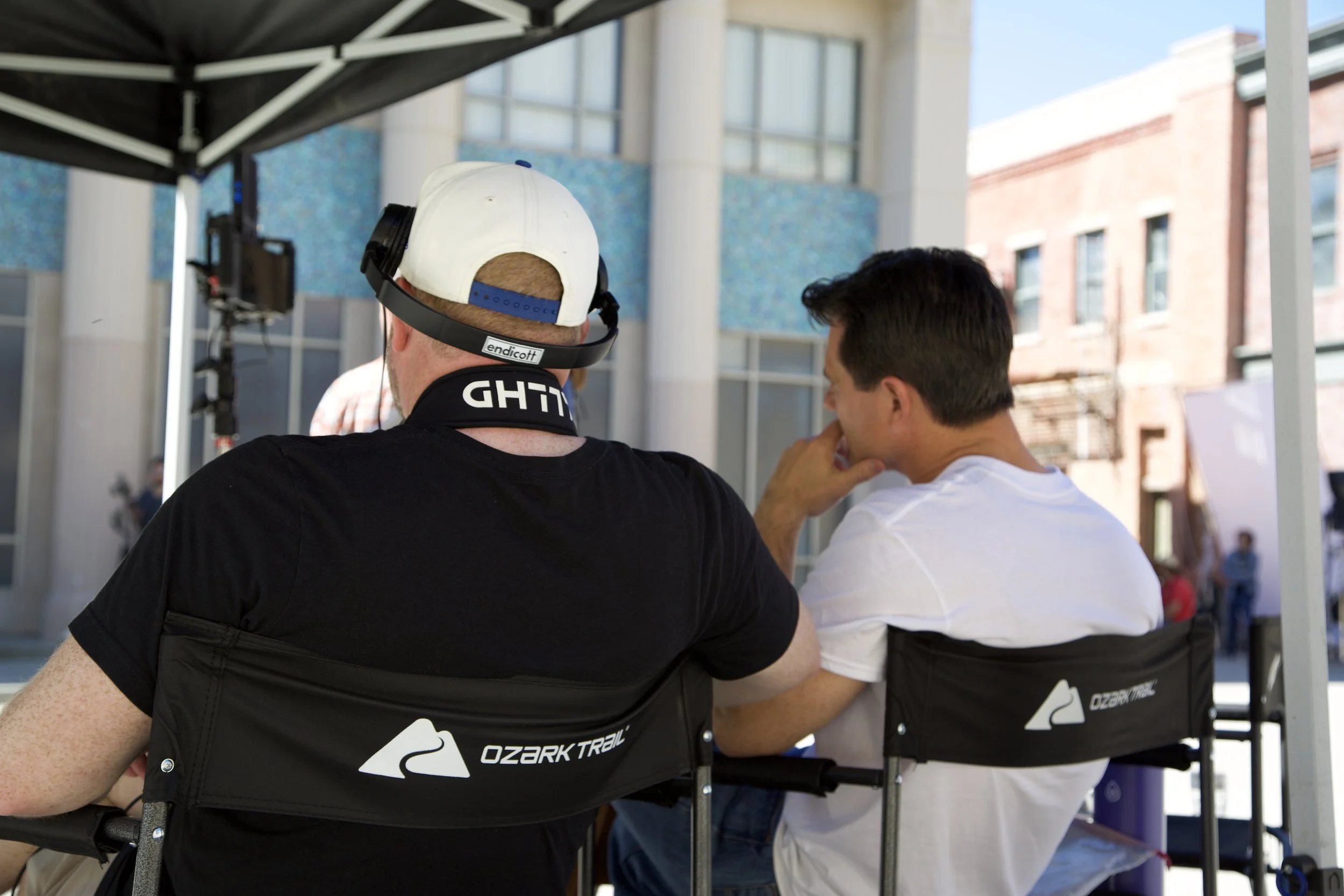 Director Matt Green (left) and Brannon catching a break from the springtime heat in between scenes.