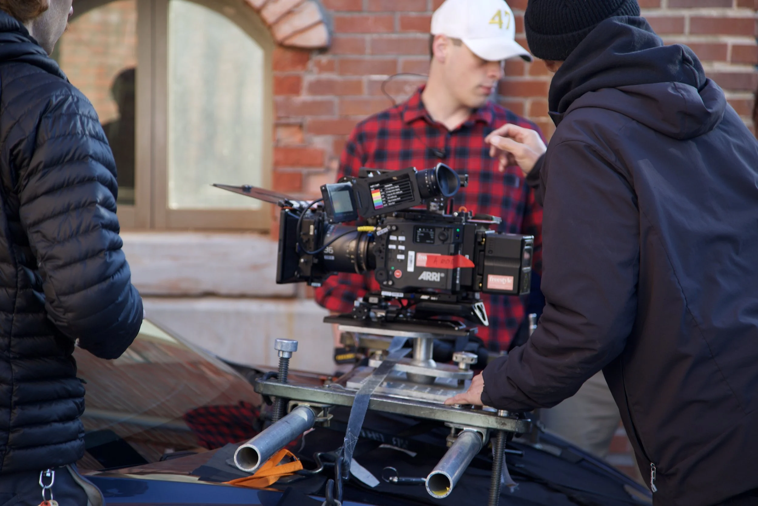 Grip crew rigging a camera onto the hood of director Matt Green’s car to shoot a driving scene.