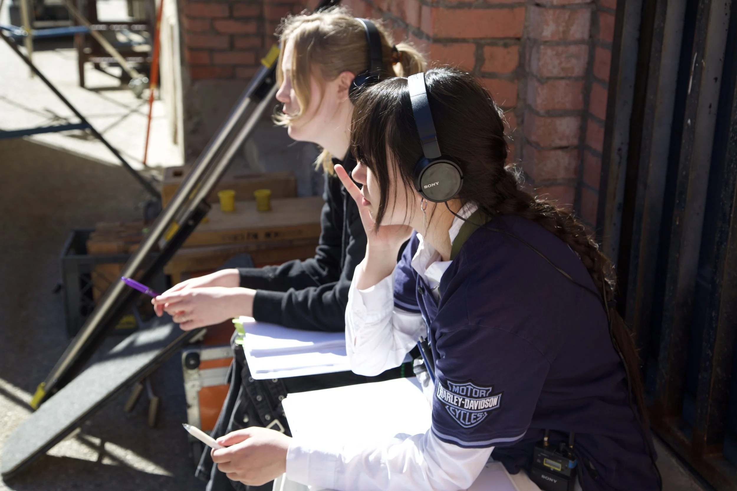 Script supervisors Adelle Laporte (back) and Jaden Demerais (front) making sure the entire script gets filmed.